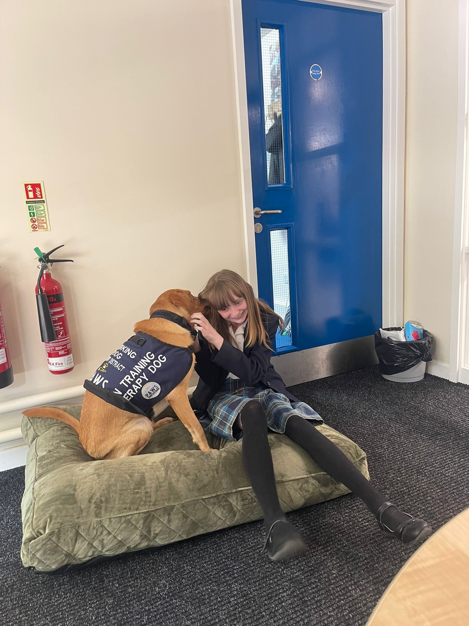 The dog will be kept in Mrs Schwartz’ office, secured, when needed a sign will always be on display if GUS is in any room to allow the dog to have more space to roam when he is not working, he will also has access to Assistant principal Miss Woods office, the SEN office, all who will support Mrs Schwartz in caring for the school dog. GUS will also attend some meetings with staff to support further socialisation, and support staff well-being, following consultation with staff beforehand.